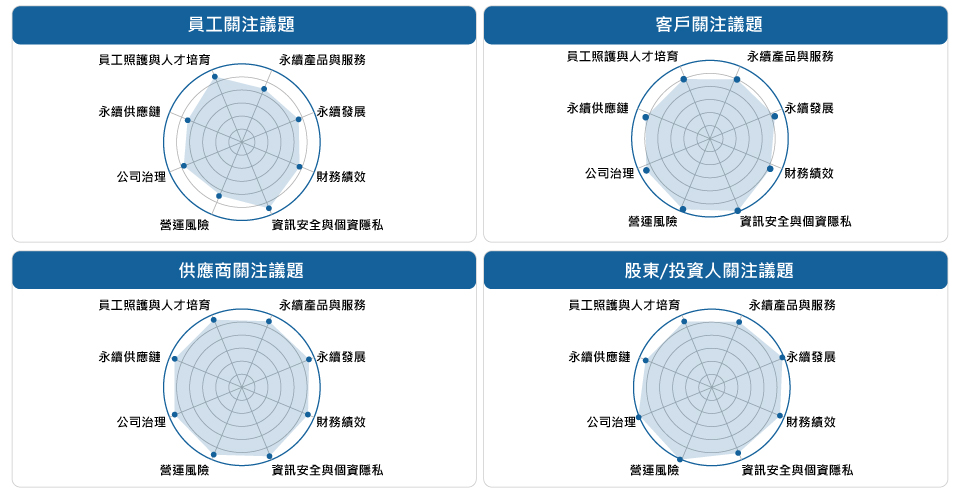 | 主題評估與量化分析 | 結合雙重重大性原則,由永續發展工作小組之組長、副組長與事業單位主管填寫「重大性主題評估問卷」,從「對企業營運的影響」與「永續衝擊程度」兩面向進行打分,並導入統計標準化方法進行排序分析。 |