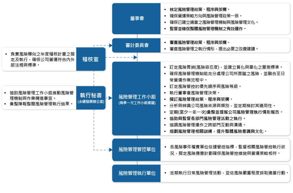 組織面於2024年設置【風險管理工作小組】協助與監督風險管理活動之執行,落實風險管理運作。