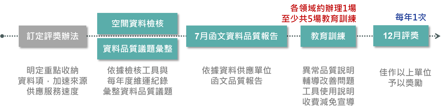 資料品質管理:資料品質的維持有賴來源單位配合,透過有制度之資料品質管理程序,以評獎作業來給予激勵。